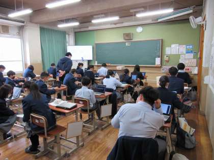 1年2組の社会の授業では、「日本の企業として海外進出しよう」というテーマで、タブレット使って調べ、どの国に進出して何を生産するのかなどを考え、「こじか」を意識してまとめました。