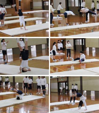 1年4組の体育は、「マット運動」の各種目を練習しました。
