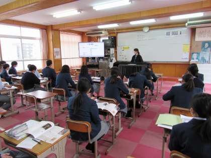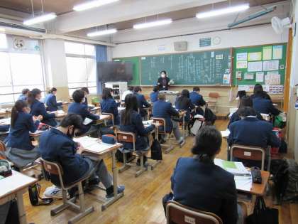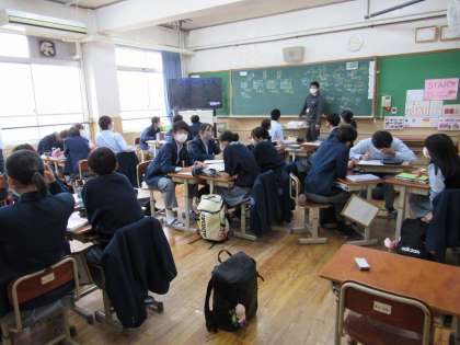 3年2組の音楽の授業では、「世阿弥作、能“敦盛”」を題材に「能」の音楽の「囃子」と「謡(うたい)」について学びました。