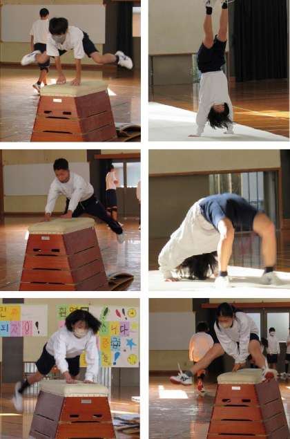 1年2組の体育の授業では、「マット運動」の各種目の練習をしました。