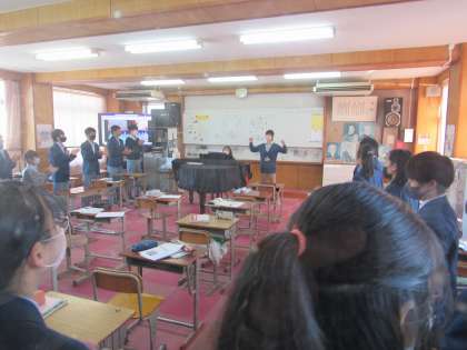 1年4組の音楽の授業では、定期テストに向けた復習に続き、本日に行われる中級学校との交流会に向けて、「THE BOOMの“風になりたい”」の合唱練習をしました。