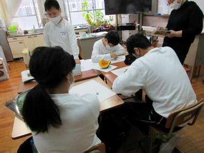 1組の美術の授業では,「自然の美しさに触れて表す」というテーマで模刻するための準備として、カボチャをモチーフにスケッチをしました。