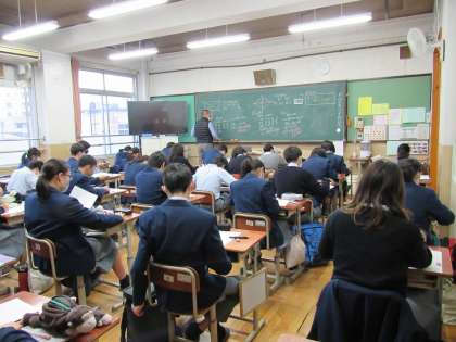 2年3組の家庭科の授業では、「肉の調理上の性質を理解し、工夫して調理する」というテーマで、まず、肉料理の種類、肉の主な栄養素、続いて調理上の性質について考えました。