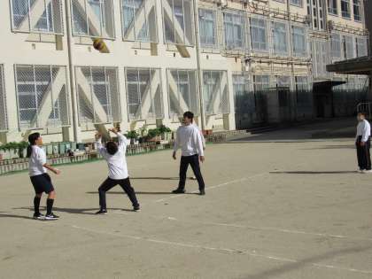 1組の生活の授業では、栽培している作物への水やりの後、余った時間でバレーボールを使って、レシーブで繋げられる回数に挑戦しました。