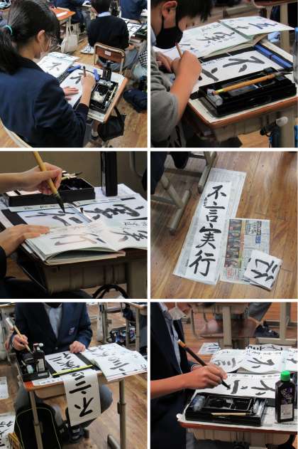 1年3組の国語(書写)の授業では、書初め用紙に行書で「不言実行」を書きました。