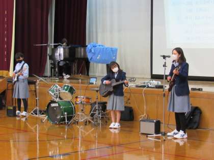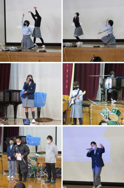 2学期を学習面、生活面そして全体面から振り返った後、有志によるパフォーマンスが行われ、オリジナル振付けによるダンス、楽器と歌の演奏、ダンスなどが披露され、最後に2年生担当教師の飛び入り参加があり、場が一層の盛り上がりを見せました。