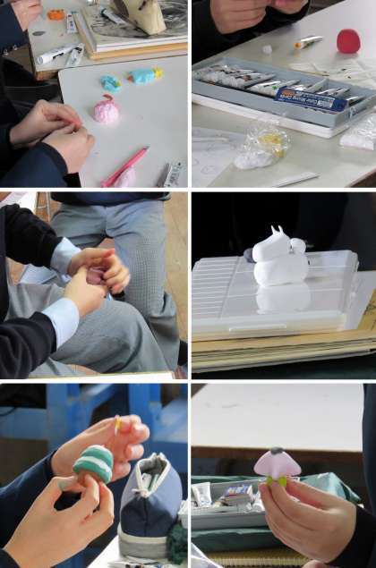 3年2組の美術の授業では、自由課題で紙粘土による和菓子づくりをしました。