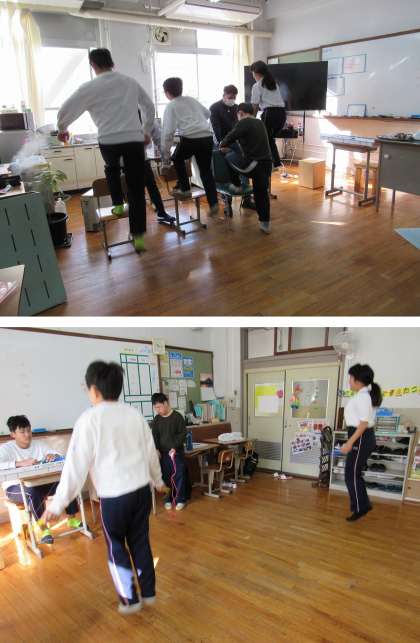 1組の生活の授業では、2限目に基礎体力向上トレーニングとして、階段昇降と縄跳びをしました。