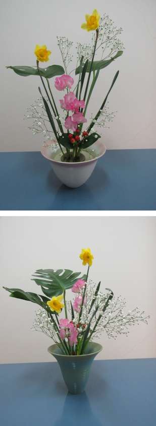 自由花で、花と花の空間を保ち、花同士が互いに引き立たせ合うような生け方に挑戦しました。