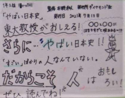 今回紹介するのは、1年3組のKさん(上・「やばい日本史」)、Kさん(中・「魔法のバスケレッスン」)、Mさん(下・「エトワール!」)の作品です。