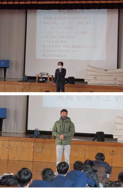 学校長からの激励、そしてエピソードを交えながら、受験にするにあたっては平常心で臨むこと、そのための具体的な方策の指導、続いて進路担当のO先生と学年主任のI先生からそれぞれ諸注意がありました。