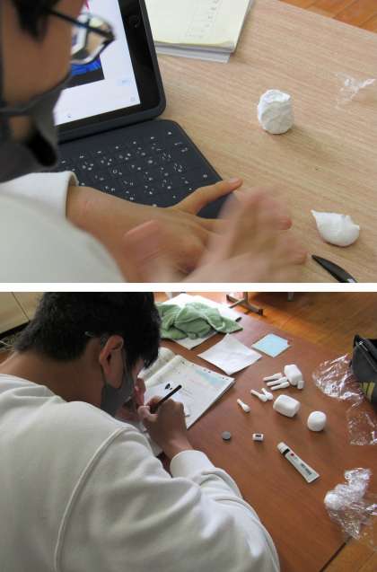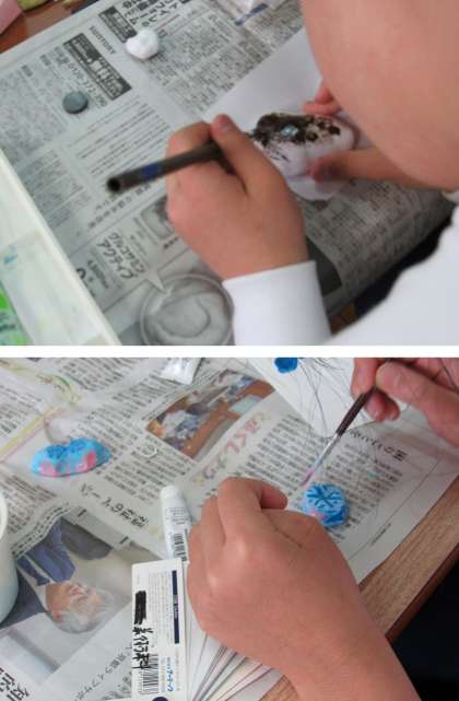 1組の美術の授業では、前回に続き、軽量紙粘土と磁石を使って、マグネット(文具)づくりをしました。