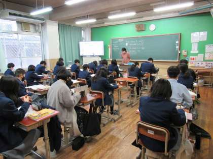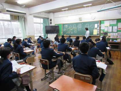 1年4組の数学の授業では、定期テストに向けて空間図形の復習をしました。