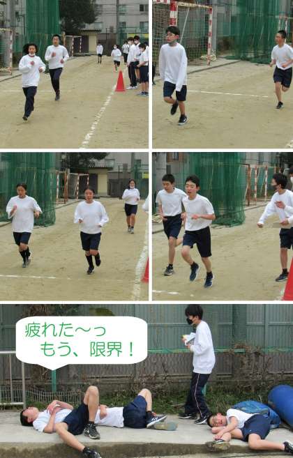 1年2組の体育の授業では、1,500mトライアルをしました。「あと…秒、いけるぞ」などの声援を受け、みんなよく頑張っていました。