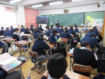 2年2組の英語の授業では、行ってみたい世界遺産についてペア間で伝え合い、続いて定期テストに向けてのリスニング練習をしました。