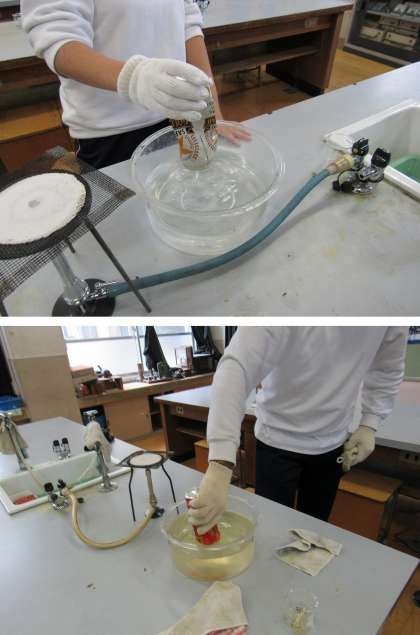 1組の理科の授業では、大気圧で缶をつぶす実験をしました。