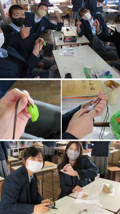 3年2組の美術の授業では、前回に続き、勾玉づくりをして、これを完成させました。