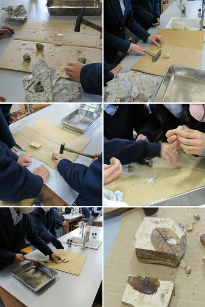 1年4組の理科の授業では、化石採取の模擬体験として各地の地層から採取した岩石を割って、化石を確認しました。