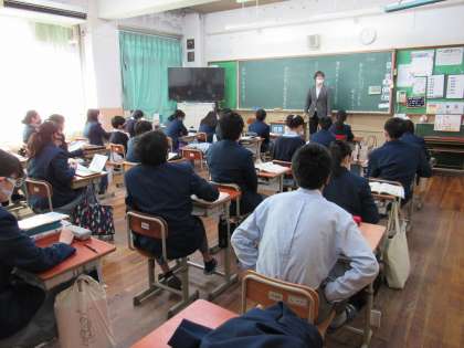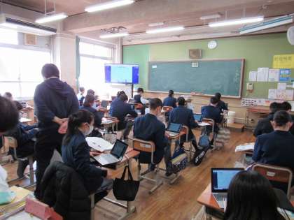 1年4組の国語の授業では、校外学習に関する調査報告のためのスライドを班ごとに作成しました。