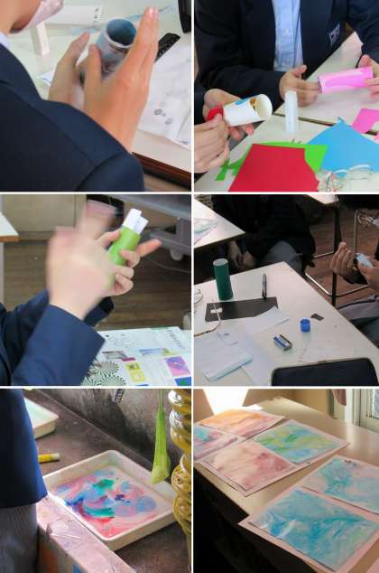 筒の外側と内側には、マーブリングや折り紙を貼り付けました。