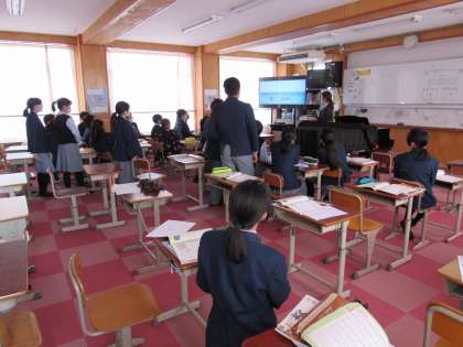 1年4組の音楽の授業では、「イメージを膨らませて音楽を捉えよう」というテーマで、映画「ジョーズ」のテーマ音楽を鑑賞しました。