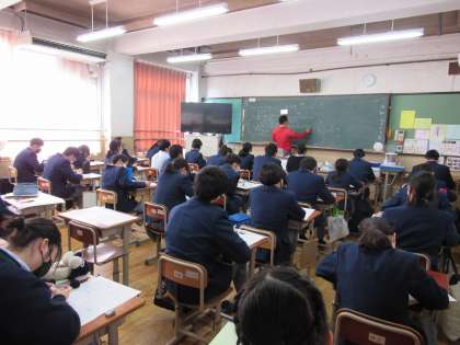 2年2組の数学の授業では、今回の中期試験問題の内、1、2年の範囲の問題に挑戦しました。