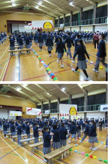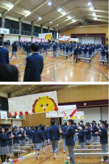 1、2年生が拍手で待ち受ける中、手作りのゲートを通って3年生が入場して来ました。