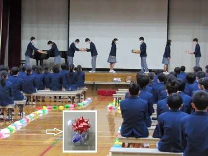 続いて、在校生を代表して生徒会役員から3年生のクラス代表に対し、卒業式に着けるコサージュが贈呈されました。