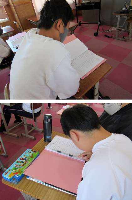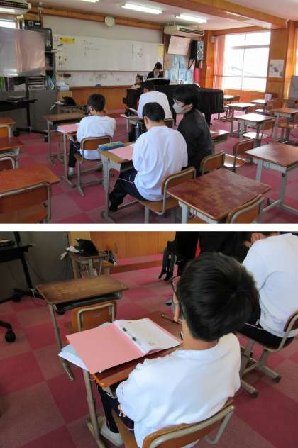 1組の音楽科の授業では、明瞭な発音に気を付けながら「校歌」の練習を行い、続いて「石崎ひゅうい作詞・作曲“虹”」の歌唱練習をしました。