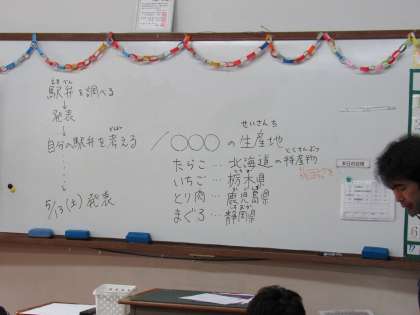 1組の社会科の授業では、「オリジナル駅弁を考えよう」というテーマで、自分の好きな具材がどの都道府県の特産物になっているかについて調べました。