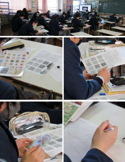 3年2組の美術科の授業では、「琳派」を模写してそれを参考にした「和」のオリジナルデザインによる扇子型のしおりの制作に取り掛かりました。