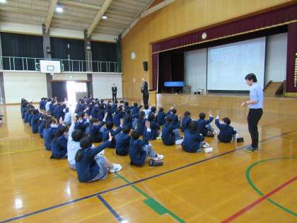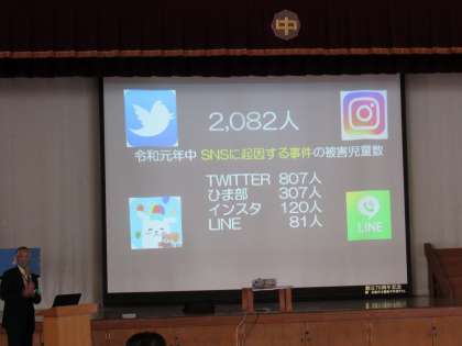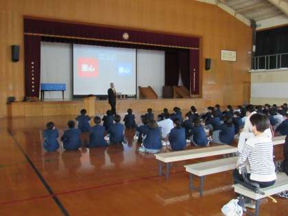 本日(13日、土曜参観日)4限目に1年生を対象に上京警察署員の方を講師にお迎えして、体育館でネットトラブル防止教室を開催しました。