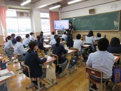 2年4組の音楽科の授業では、最初に「夏の思い出」の復習をし、続いてパイプオルガン曲の代表作であり、またポリフォニー音楽としても有名な「バッハ作曲、“フーガト短調”」を題材として、パイプオルガンの仕組みやモノフォニー音楽とポリフォニー音楽の違いについて学びました。