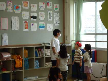小学校では1年生の教室で休憩中、「ねぇ,ねぇ。」と児童のみなさんと話している様子が見られました。優しく受答えしている様子が印象的でした。また、2年生の教室ではテストが始まる様子。先生からの説明を静かに聞いていました。