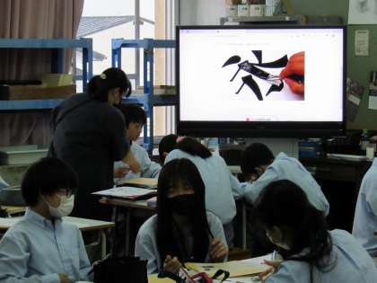 1年2組の美術科の授業では、前回と同じく、各自の美術ファイルの表紙への明朝体若しくは絵文字による題字「美」、そして明朝体若しくはゴシック体による学年組、出席番号のレタリングの続きをしました。