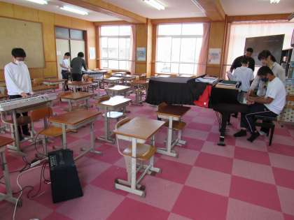 1組の音楽科の授業では、「KAN作詞・作曲“愛は勝つ”」及び数曲の歌唱練習と楽器(ピアノ、キーボード、マリンバ、タンバリン)の合奏練習をしました。