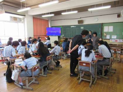 2年2組の英語科の授業では、ALTの先生とクイズ形式による文法の復習をしました。