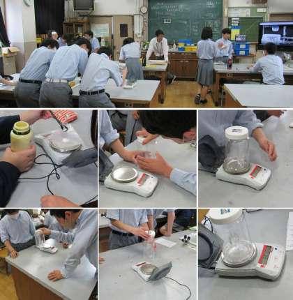 2年3組の理科の授業では、密閉した容器内において炭酸水素ナトリウムと塩酸による化学変化の前後で質量が変化するかどうかという実験をして、質量は変化しないことが分かりました。しかし、容器の蓋を外して開放してやると、化学変化により発生していた二酸化炭素が抜けた分だけ、軽くなりました。