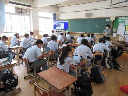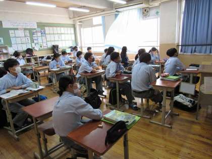 3年2組の英語科の授業では、修学旅行を題材にした英語の作文の後、現在完了(継続)の表現を使った言語活動をしました。