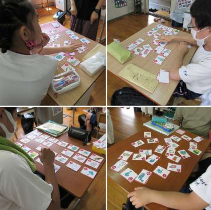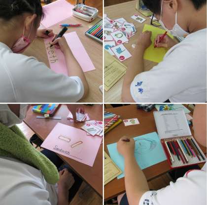また、4限目の英語科の授業では、英語版カルタ取りの後、好きなアルファベットで始まる物の名称と絵を描いてみました。