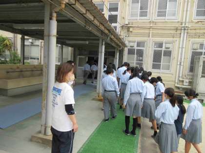地震による揺れのあと、理科室から火災が発生するという想定です。グラウンドへ速やかに移動できました。