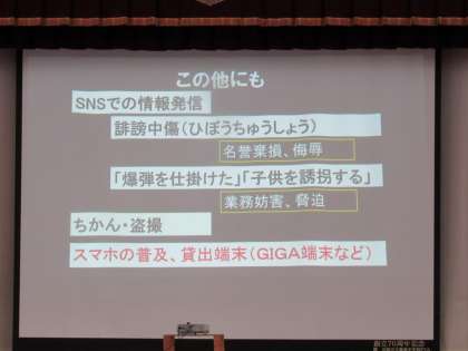 「非行となる行為の類型」に始まり、「いじめの防止」、「スマホ・SNSの危険性」を中心に解説されました。