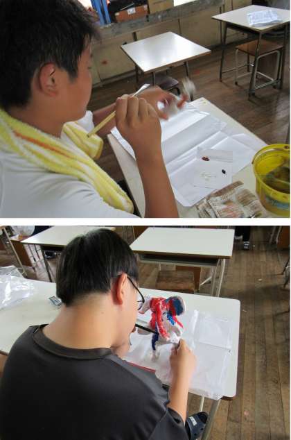 1組の美術科の授業は、前回、「嘉楽中学校に生きる生き物」と題して、新聞紙と半紙により立体制作した想像上の生き物の作品に彩色をしました。