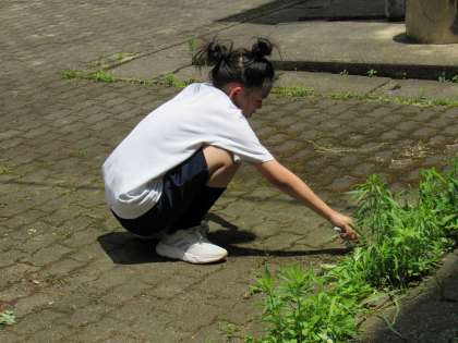 1組の生活科の授業では、栽培している作物への水やりに続いて、雑草(牧野富太郎先生に叱られそう…^_^);)取りやミニトマトとピーマンを収穫したりしました。