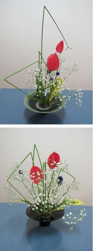 今回、花材として「ルリタマアザミ」「フトイ」「アンスリウム」「カスミソウ」「クロトン」を使用しました。