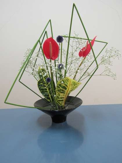 フトイを曲げて作った空間内に花々をバランスよく配置し、自由花で生けました。