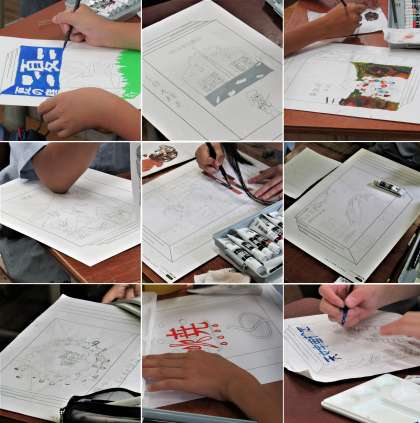 1年2組の美術科の授業では、前回に引き続き、図書室で選んだ本の表紙のオリジナルデザイン作りをしました。
