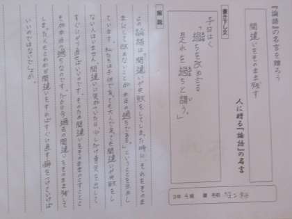 3 この論語は「間違いや失敗をしてしまった時に、それをそのままにして改めないことが、本当の過ちである。」ということを示しています。私たちは子供であっても大人であっても間違いや失敗をしない人はいません。間違いに気がついたら、少しだけ勇気を出してすぐにやり直せばいいのです。そのため間違いをそのままのこすことこそが本当の過ちなのです。だから今過去の間違いをそのまま残してしまった人もこれから間違いをすればすぐに直す癖をつけていけばいいのではないでしょうか。