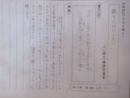 3 この論語は「父母の年は知っておかねばならない。一つにはその長命を喜び、一つには高齢や不測の事態が起こるのを恐れるのである。」という意味です。長命を喜び、不測の事態が起こるのを恐れるのは、父母のことを大切に思っているからだと私は考えたので、この論語を「親を大切にしたい人」に贈ります。