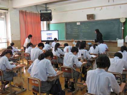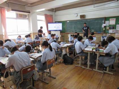 2年2組の英語科の授業では、動名詞「…ing」を学習し、Blueの“The gift”という歌を聞き取り、単語の穴埋めをしました。